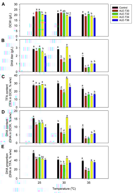 Comparative analysis of biomass and lipid production between the acid-tolerant (BBF001) and four adaptive laboratory evolution (ALE) strains grown at 25, 30 and 35 °C for 5 days. (A) Dry cell weight (g/L); (B) docosahexaenoic acid (DHA) titer (g/L); (C) TFA content (TFA in DCW, % w/w); (D) DHA content (DHA in DCW, % w/w); and (E) DHA proportion (DHA in TFA, % w/w). Different lowercase letters represent significant differences between the same temperature test groups (p < 0.05).