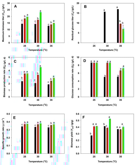 Comparative analysis of growth between the native (black), acid-tolerant (BBF001; red), and acid- and temperature-tolerant (BBF002; green) strains grown at different temperatures for 5 days. (A) Maximum biomass titer; (B) residual glucose titer; (C) biomass production rate; (D) glucose consumption rate; (E) specific growth rate; and (F) biomass yield from substrate. Different lowercase letters represent significant differences between the same temperature test groups (p < 0.05).