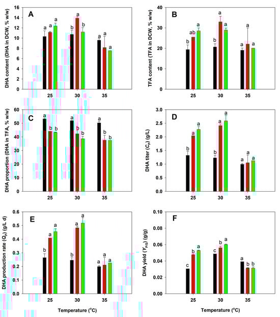 Comparative analysis of docosahexaenoic acid (DHA) production between the native (black), acid-tolerant (BBF001; red), and acid- and temperature-tolerant (BBF002; green) strains grown at different temperatures for 5 days. (A) DHA content in dry cell weight (DCW); (B) total fatty acid (TFA) content in DCW; (C) DHA proportion in TFA; (D) DHA titer; (E) DHA production rate; and (F) DHA yield from the substrate. Different lowercase letters represent significant differences between the same temperature test groups (p < 0.05).