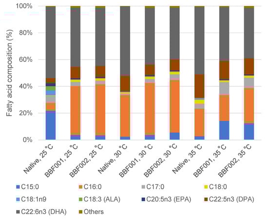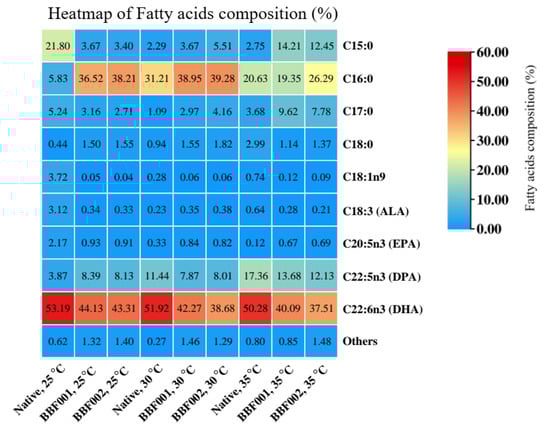 The fatty acid profiles after adaptation and cultivation at different temperatures are shown in Figure 4. The fatty acid composition changed after adaptation. Under normal temperature, the fatty acids in the native strain mainly comprised 21.80% C15:0 and 53.19% DHA, whereas the BBF001 and BBF002 strains contained C16:0 and DHA as the major fatty acids. The percentage of C16:0 increased from 5.83% in the native strain to 36.52% and 38.21% in the BBF001 and BBF002 strains, respectively. Moreover, the docosapentaenoic acid (DPA) content in adaptive strains increased to 8.13–8.39% whereas it was 3.87% in the native strain. However, the composition of DHA decreased to 44.13% and 43.31% in the BBF001 and BBF002 strains, respectively. The increase in DPA content was similar to that in the adaptation of Schizochytrium sp. CCTCC M209059 under high temperatures []. However, changes in the fatty acid composition were also observed when cultivated at high temperatures. The percentage of C16:0 in the native and adaptive strains was significantly increased when the culture temperature increased to 30 °C and then decreased at 35 °C. Therefore, the highest C16:0 proportions in the native, BBF001, and BBF002 strains were 31.21, 38.95, and 39.28%, respectively, at 30 °C. Unlike C15:0, increased temperatures decreased the proportion of C15:0 in the native strain, but increased it in the adaptive strains. Therefore, the highest C15:0 content was found at 25 °C, being approximately 21.80% of that in the native strain, whereas it was 14.21 and 12.45% in the adaptive BBF001 and BBF002 strains at 35 °C. For polyunsaturated fatty acids, the increased culture temperature increased the proportion of DPA but decreased that of DHA in all the strains; the highest composition of DPA in the native, BBF001, and BBF002 strains was 17.36, 13.68, and 12.13%, respectively, at 35 °C and that of DHA was 53.19, 44.13, and 43.31% at 25 °C, respectively. Moreover, the change in fatty acid composition from heatmap analysis (Figure 5) emphasized significant differences between the native and BBF strains at various temperatures ranging from 25 to 35 °C. The native strain was characterized by higher levels of DHA coupled with lower amounts of C16:0. In contrast, the BBF strains, especially at temperatures between 25 and 30 °C, exhibited a higher concentration of C16:0 and a diminished presence of DHA compared to the native strain.