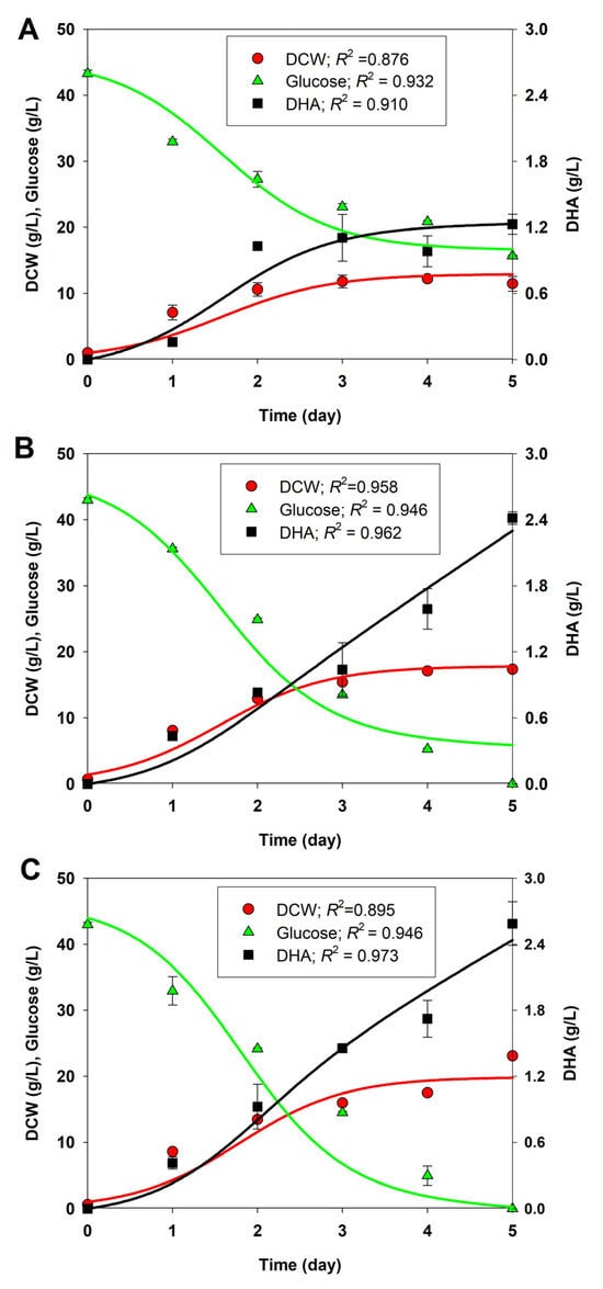 Considering the improved performance of BBF002 with regard to biomass (Figure 2) and DHA production (Figure 3) at pH 4.5 and 30 °C, we chose the experimental data of growth, glucose consumption, and DHA production under these cultivation conditions for kinetic modeling. The results of this study were compared with those obtained for native and BBF001 strains cultured under the same conditions. The experimental data for cell growth, glucose consumption, and DHA production for the native, BBF001, and BBF002 strains cultivated at pH 4.5 and 30 °C were used to construct the kinetic models. The kinetics of cell growth, glucose consumption, and DHA production, described by Equations (7)–(10) (see Section 2), were used to simulate the models, along with the experimental data for the cultures. As shown in Figure 6, the growth, glucose consumption, and DHA production profiles for the native (Figure 6A), BBF001 (Figure 6B), and BBF002 (Figure 6C) strains fitted well with the experimental data (R2 > 0.87), indicating that the growth traits of the three strains could be described well by a logistic model using glucose as the carbon substrate. Glucose was consumed to produce biomass, including lipids, DHA, and other intracellular metabolites, as well as for biomass maintenance. DHA could be produced as a mixed-growth associated product during the exponential and stationary phases, according to the Luedeking–Piret equation. The values of the best-fit model parameters (µmax, CXm, mS, α, and β) were illustrated in Table 1.