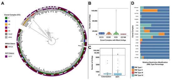 Clinical and molecular characteristics of Staphylococcus aureus from skin and soft tissue (SSTI; n = 131) and nasal colonization (n = 31) in the community. (A) Core genome single-nucleotide polymorphic (SNP) tree of 157 community skin and soft tissue (SSTI; n = 126) and nasal-colonizing (n = 31) Staphylococcus aureus isolates and NCTC 8325 (CC8 reference isolate). Metadata provided for methicillin resistance phenotype, SSTI status, and Multilocus Sequence Typing (MLST). Tree branch lengths reflect genetic distances derived from SNP profiles. The segmented inner ring shows MLST (Multilocus Sequence Typing) types, with the following color scheme: green for type 8, blue for type 30, orange for type 45, purple for type 5, red for type 15, gray for novel or untyped isolates, and light gray for other types not specified. The middle metadata ring denotes MRSA (methicillin-resistant Staphylococcus aureus) status, where dark red indicates methicillin-resistant samples and white represents methicillin-susceptible samples. The outer ring displays SSTI status, with purple for SSTI and white for nasal-colonizing samples. (B) A violin plot of the distribution and density of unitig counts across these clonal complex (CC) groups. The x-axis is ordered by the average unitig count for each CC type. Outliers were highlighted and counts above a threshold of 5500 unitigs were displayed on an extended y-axis. (C) Total count of unitigs per sample grouped by infection phenotype (SSTI or colonization). Black dots represent individual sample unitig counts; red dots indicate outlier samples exceeding the 5500 unitig threshold. (D) Distribution of restriction–modification (RM) system types among isolates, shown as stacked bar plots by clonal complex.