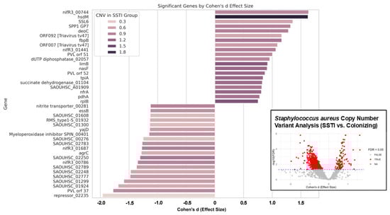 A total of 1048 genes demonstrated significant copy number differences between the two phenotypes after FDR correction (FDR < 0.05). Cohen’s d effect sizes ranged from –1.96 to +1.63, where positive values indicate higher CNVs in SSTI isolates and negative values suggest higher CNVs in colonization isolates. Among the top genes with the highest positive effect sizes (Cohen’s d ≥ 0.75, Figure 2), several encode phage-related or virulence-associated functions. For example, SAOUHSC_00744, encoding the nitrogen regulation protein NIFR3, had the strongest positive effect (Cohen’s d = 1.63, FDR = 1.3 × 10−4), with significantly elevated CNVs in SSTI isolates. Other highly enriched genes included a site-specific DNA-methyltransferase (SAOUHSC_00397, d = 1.62, FDR = 1.6 × 10−6), a staphylococcal superantigen-like domain-containing protein (SAOUHSC_00391, d = 1.36), and fibronectin binding protein B (SAOUHSC_02802, d = 1.16). Notably, these genes include elements involved across host immune modulation, bacterial adhesion, and phage interactions.