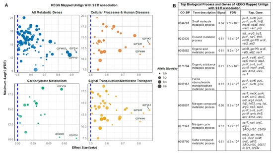 To identify functional categories enriched in S. aureus genes associated with SSTI, unitig-based association statistics were merged with KEGG pathway hierarchies. A total of 59 unitig-mapped genes met the filtering thresholds of a lineage-adjusted −log10 p-value ≥ 6.3 and an average effect size (β) ≥ 0.5 (Supplemental Data S1). These genes were mapped to multiple KEGG biological categories, including metabolism, environmental information processing, and cellular processes (Figure 3).