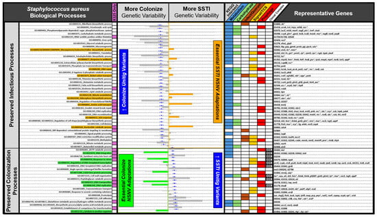 In contrast, NSNV enrichment patterns diverged from those observed in unitig analysis. Among the fifty-nine biological processes enriched for unitigs, nine processes showed significantly greater NSNV enrichment in SSTI strains despite unitig enrichment in colonizing strains. These included critical metabolic and stress-adaptive pathways such as menaquinone, isoleucine, and valine biosynthesis, nitrate assimilation, amino acid transport, DNA repair, and SOS response. These were classified as “Essential SSTI Adaptations” due to their importance for in vivo persistence. Conversely, seven processes demonstrated increased unitig associations with SSTI but higher NSNV enrichment in colonizing strains, including pathways tied to DNA processing, transcriptional regulation, and stress responses. This inverse pattern suggests that while certain functions may be expanded or maintained at the structural level in infection isolates, colonizing strains may harbor sequence-level variation in these same pathways, potentially modulating their expression or activity.