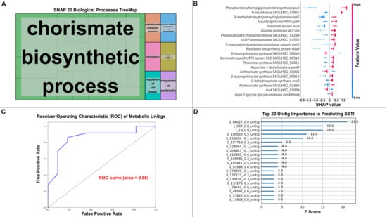 (A) SHAP top twenty genes biological process treemap. (B) SHAP plot of unitigs with names of mapped gene names. (C) ROC of XGBOOST model build by unitigs mapped to metabolic genes from 156 Staphylococcus aureus clinical isolates. (D) XGBOOST important unitigs which map to metabolic genes for predicting purulent cellulitis. ‘1_19_0.8_unitig’ maps to purL (accession: Q2FZJ0); ‘1_947_0.8_unitig’ maps to Aspartyl/glutamyl-tRNA amidotransferase subunit B (accession: Q2FWZ0); and ‘1_66027_0.6_unitig’ maps to 1-(5-phosphoribosyl)-5-[(5-phosphoribosylamino)methylideneamino] imidazole-4-carboxamide isomerase (accession: Q2FUU2).