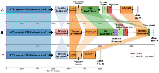 Genomic regions with α/β-hydrolase domain gene from SSTI and Colonizing Staphylococcus aureus strains. (A) α/β-hydrolase domain gene genomic context from SSTI strain. (B) α/β-hydrolase domain gene genomic region from nasal-colonizing strains with insertion sequence disrupted SAL3. (C) Genomic region of nasal-colonizing strains which lack α/β-hydrolase domain gene. Arrows indicate 5′ to 3′ strand direction across genomic regions. Color links indicate sequence homology between related genomic regions.