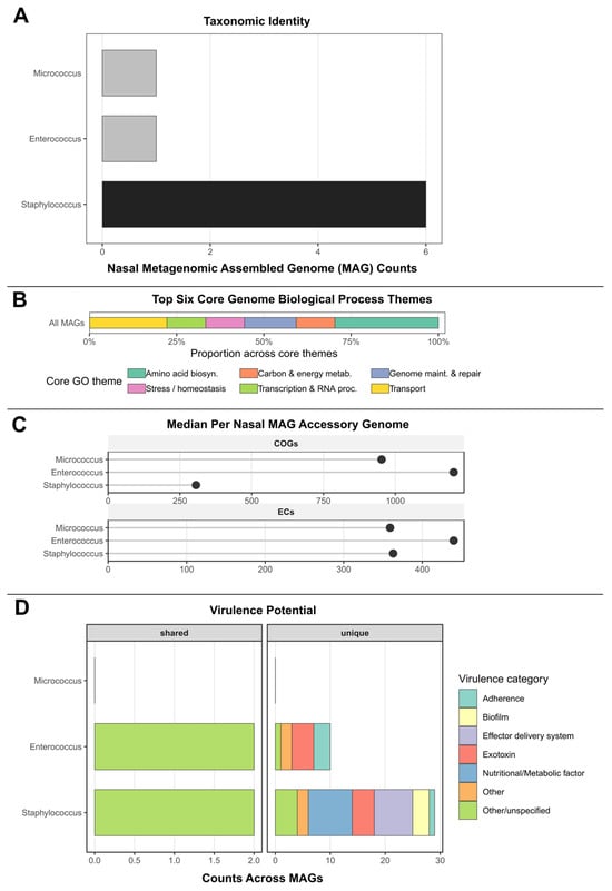 All high-quality bins uniformly retained the defined set of 94 core GO biological process terms, encompassing amino acid biosynthesis, genome maintenance and repair, central carbon and energy metabolism, nucleotide metabolism, transcription/RNA processing, translation/protein maturation, transport, stress response, and cell envelope/division processes (Figure 7B). In Staphylococcus bins, this conserved metabolic backbone was paired with variable accessory gene capacity, including COG and EC profiles (Figure 7C) consistent with environmental sensing, nutrient acquisition, and interactions with host-derived substrates. Detected enzymatic activities span cofactor metabolism, energy production, and substrate interconversion, indicating active participation in diverse biochemical conversions relevant to persistence in the nasal niche. Enterococcus exhibited the largest accessory repertoire by gauging COGs and numerous EC-numbered enzymatic activities suggesting high metabolic flexibility, while Micrococcus maintained a smaller, diverse accessory set (Figure 7C).