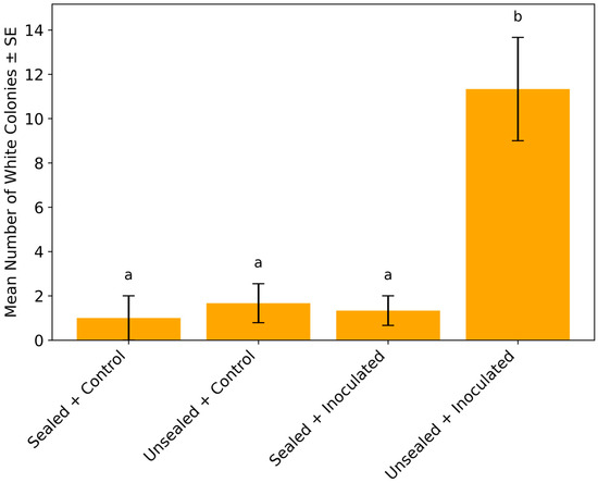Comparison of Simplicillium-like white colony counts across treatments. The unsealed inoculated treatment yielded a mean of 11.3 ± 2.3 white Simplicillium-like colonies per replicate, significantly higher than the sealed inoculated (1.3 ± 0.7), unsealed control (1.7 ± 0.9), and sealed control (1.0 ± 1.0) groups (one-way ANOVA, F (3, 8) = 13.08, p = 0.002). Tukey’s HSD test (p < 0.05) indicated that the unsealed inoculated treatment was significantly different from all other treatments. Different letters (a, b) above the bars denote statistically distinct treatments. Each treatment included three replicates (n = 3).