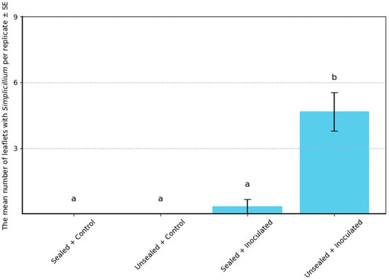 Comparison of the number of Simplicillium-covered leaflets across treatments. The unsealed inoculated treatment yielded a mean of 4.7 ± 0.9 leaflets (nine per replicate) from which Simplicillium isolates per replicate, significantly higher than the sealed inoculated (0.3 ± 0.6), unsealed control (0.0 ± 0.0), and sealed control (0.0 ± 0.0) groups (one-way ANOVA, F (3, 8) = 23.46, p = 0.0003). Tukey’s HSD test (p < 0.05) further indicated that the unsealed inoculated group was significantly different from all other treatments. Although Levene’s test supported homogeneity of variance (p = 0.951), the residuals deviated from normality (Shapiro–Wilk test, p = 0.038). Therefore, we additionally performed a Kruskal–Wallis test, which confirmed significant differences among treatments (p = 0.025). A post hoc Dunn’s test with Bonferroni correction showed significant differences between the unsealed inoculated group and both the sealed inoculated and control groups (p < 0.05), while the difference between the sealed and unsealed inoculated treatments was marginally non-significant (p = 0.13). Different letters (a, b) above the bars indicate statistically distinct groups based on Tukey’s HSD test. Each treatment included three replicates (n = 3).