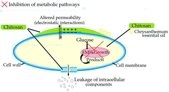 - Inhibition of metabolic pathways: It has been observed that combining chitosan with chrysanthemum essential oil, can inhibit key metabolic pathways, such as the Embden–Meyerhof–Parnas (EMP) pathway in L. monocytogenes, further reducing its viability [121].