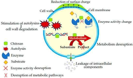The mechanisms by which chitosan inhibits the growth of S. aureus in food products are complex and include the following (Figure 2):