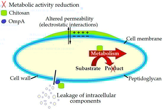 Interaction sites between chitosan and Gram-negative bacteria are associated with electrostatic interactions involving the negative charges of lipopolysaccharide LPS [108], resulting in changes in permeability. Helander et al. [108] compared the antibacterial activity of a normal strain of Salmonella Typhimurium with anionic LPS with that of an abnormally cationic LPS mutant strain. Both the normal and mutant S. Typhimurium strains in the stationary phase were resistant to chitosan at concentrations of up to 20,000 ppm. However, when the bacteria were grown to the middle of the logarithmic phase, the mutant strain with a high cation content retained viability, whereas the viability of the normal strain decreased by 3 log10 CFU/mL [108]. As the outer membrane acts as an effective permeability barrier to macromolecules, the macromolecule chitosan is unable to cross the outer membrane of Gram-negative bacteria [115]. However, Helander et al. [108] demonstrated membrane damage in Gram-negative bacteria treated with chitosan, suggesting that it binds to the outer membrane, leading to a loss of barrier function.
