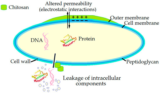 The most widely accepted theory of the primary antimicrobial mechanism of chitosan, is that its positively charged amino groups of chitosan bind to negatively charged bacterial membrane, disrupting membrane integrity, forming pores, and causing cell leakage and death [107,108,109,110,111]. Chitosan also potentially enters cells, binds to DNA, and interferes with mRNA synthesis and protein production [112].