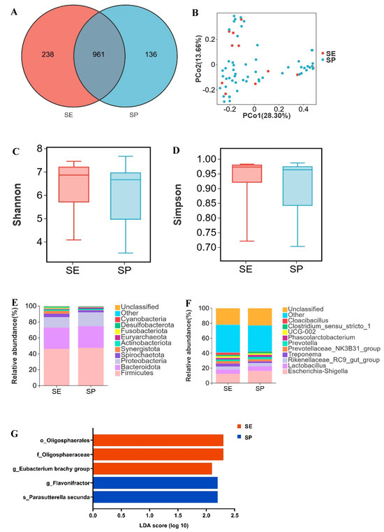 SE and SP shared 961 OTUs, with 238 OTUs unique to SE and 136 OTUs unique to SP (Figure 1A). Principal coordinates analysis (PCoA) based on Bray–Curtis distance revealed distinct clustering of SE and SP samples (Figure 1B). No significant differences were observed in Shannon or Simpson indices (p > 0.05; Figure 1C,D). Both SE and SP exhibited dominant phyla Firmicutes (46.3% vs. 47.4%), Bacteroidota (26.7% vs. 27.3%), and Proteobacteria (13.1% vs. 17.3%) (Figure 1E). The relative abundance of Synergistota was higher in SE (3.6%) than in SP (0.5%). Dominant genera shared by SE and SP included Escherichia shigella (12.4%, 16.2%), Lactobacillus (5.9%, 6.3%), and Rikenellaceae RC9 gut group (3.9%, 4.2%) (Figure 1F). Cloacibacillus (in phyla Synergistota) demonstrated greater abundance in SE versus SP. Using LDA > 2 and p < 0.05 as thresholds, differential microbial analysis revealed significantly elevated abundance of Eubacterium brachy group in SE compared to SP, whereas Flavonifractor showed reduced abundance in SE (Figure 1G, Table S1). Overall, the microbiota composition of the SE and SP groups was similar, with observed differences mainly due to changes in the relative abundance of specific bacterial genera.