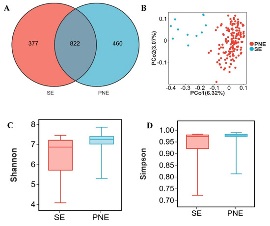 Piglet gut microbiota primarily derives from sows, with significant compositional differences observed between lactating sows (SE; body weight: 150–200 kg) and market-weight pigs. Integration of gut microbiota from all pigs ≥ 120 kg (designated PNE) enabled analysis of microbial alterations in lactating sows. Although 822 OTUs were shared between SE and PNE, 377 OTUs were unique to SE and 460 to PNE (Figure 2A). Principal coordinates analysis demonstrated distinct clustering patterns separating SE and PNE (Figure 2B). A significant difference was indeed observed between the SE and PNE groups (PERMANOVA, p = 0.001, R2 = 0.0878). The Shannon and Simpson indices were significantly lower in SE compared to PNE (p < 0.05) (Figure 2C,D).