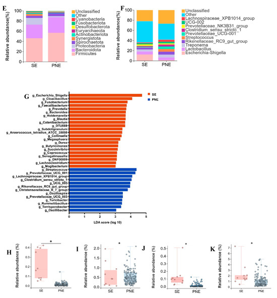 Distinct characteristic of microbial relative abundance during the lactation period. (A) Venn diagram of OTUs between lactating sows (SE) and pigs weighing > 120 kg (PNE), (B) two- dimensional PCoA plot of all SE and PNE samples, (C) Shannon index comparison (Mann–Whitney U test, p = 0.01), (D) Simpson index comparison (Mann–Whitney U test, p = 0.04), (E) top 10 phyla by relative abundance in SE and PNE, (F) top 10 genera by relative abundance in SE and PNE, (G) analysis of bacterial genera with LDA scores greater than 3 and p < 0.05 using LEfSe, “g_” = genus level, (H) the relative abundance of Lachnoclostridium, (I) the relative abundance of Ruminococcus, (J) the relative abundance of Ruminococcus torques group, (K) the relative abundance of Prevotella. * p < 0.05.