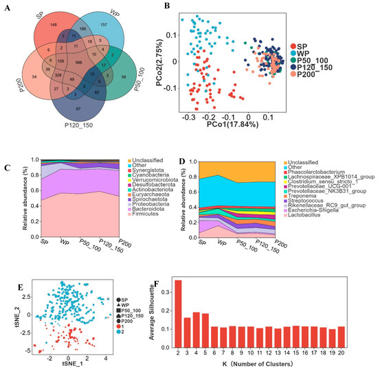 Advancing age accompanies alterations in microbial composition and relative abundance. (A) Venn diagram of OTUs across developmental stages, suckling piglets (SP), weaned piglets (WP), pigs weighing 50–100 kg (P50_100), 120–150 kg (P120_150), and >200 kg (P200), (B) two-dimensional PCoA plot of all samples, (C) top 10 phyla by relative abundance, (D) top 10 genera by relative abundance, (E) cluster-based regrouping of samples via PCoA, (F) cluster count determination with silhouette width metric, where higher values indicate superior clustering.