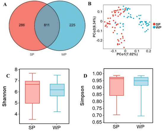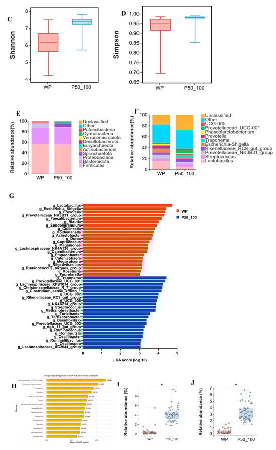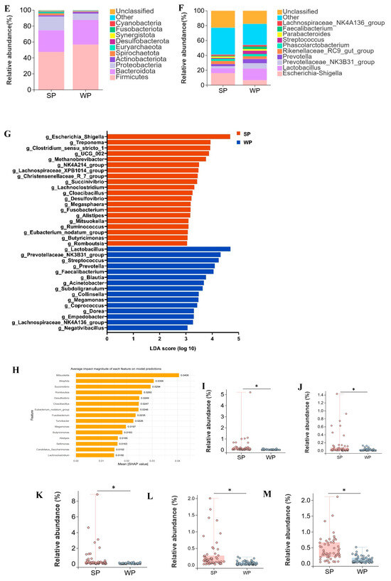 SP and WP shared 811 OTUs, while SP harbored 286 unique OTUs and WP contained 225 distinct OTUs (Figure 4A). Approximately two-thirds of individual samples formed separate clusters in PCoA ordination between SP and WP groups (Figure 4B). No significant differences (p > 0.05) were observed in the Shannon and Simpson indices between the two groups (Figure 4 C, D). At the phylum level, the dominant bacterial phyla in both SP and WP groups were Firmicutes (SP: 47.4%, WP: 56.8%), Bacteroidota (SP: 27.3%, WP: 30.9%), Proteobacteria (SP: 17.3%, WP: 8.1%), Actinobacteriota (SP: 1.6%, WP: 1.9%), and Spirochaetota (SP: 2.5%, WP: 0.9%) (Figure 4E). At the genus level, the relative abundances of Escherichia shigella (16.2%, 6.6%), Lactobacillus (6.3%, 15.7%), Prevotellaceae NK3B31 group (2.9%, 7.1%), Prevotella (3.0%, 5.7%), Streptococcus (1.1%, 4.5%), Parabacteroides (2.0%, 2.3%), Faecalibacterium (0.9%, 3.2%), and Lachnospiraceae NK4A136 group (1.7%, 2.1%) changed between the WP and SP groups (Figure 4F). Using an LDA score > 2 and p < 0.05 as thresholds, 63 differentially abundant genera were identified in the SP group and 46 in the WP group (Supplementary Table S3). Genera with LDA scores >3.0 were filtered from Supplementary Table S3. The SP group comprised 20 differential genera, including Escherichia shigella, Treponema, Clostridium sensu stricto 1, UCG-002, and Methanobrevibacter, while the WP group encompassed 15 differential genera, such as Lactobacillus, Prevotellaceae NK3B31 group, Streptococcus, Prevotella, and Faecalibacterium (Figure 4G). Mitsuokella, Bilophila, Succinivibrio, Romboutsia, and Desulfovibrio were identified as the top five genera contributing most significantly to distinguishing between the SP and WP groups (Figure 4H, Supplementary Table S4). The relative abundance of these genera was significantly higher in SP compared to WP (p < 0.05) (Figure 4I–M).