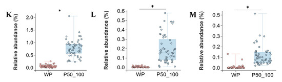 The WP and P50_100 stages represent the pivotal transition phase where intestinal microbiota succession in Dahe black pigs culminates in stabilization. WP and P50_100 shared 663 OTUs, while WP and P50_100 harbored 373 and 609 unique OTUs, respectively (Figure 5A). PCoA revealed distinct clustering of WP and P50_100 groups, with microbial composition converging as age increased (Figure 5B). Both the Shannon and Simpson indices were significantly higher in the P50_100 group compared to WP (Figure 5C,D). Firmicutes (WP: 56.8%, P50_100: 55.7%) and Bacteroidota (WP: 30.9%, P50_100: 31.2%) dominated the fecal microbiota in both groups (Figure 5E). The relative abundance of Proteobacteria was higher in WP (8.1%) than in P50_100 (1.7%), whereas Spirochaetota abundance was lower in WP (0.9%) versus P50_100 (6.3%). Distinct genus-level community composition was observed between groups (Figure 5F). Specifically, Lactobacillus (15.7% vs. 5.2%), Prevotellaceae NK3B31 group (7.1% vs. 3.1%), Escherichia shigella (6.6% vs. 1.2%), and Prevotella (5.7% vs. 0.9%) were enriched in WP relative to P50_100. Conversely, Rikenellaceae RC9 gut group (3.8% vs. 5.6%), Treponema (0.7% vs. 6.1%), Prevotellaceae UCG 001 (0.2% vs. 4.9%), and UCG-005 (1.5% vs. 3.1%) showed reduced abundance in WP. LEfSe analysis identified 67 and 61 differentially abundant genera in the WP and P50_100 groups, respectively (Supplementary Table S5). Genera with LDA scores > 3.0 were filtered from Supplementary Table S4. The WP group comprised 22 differential genera, including Lactobacillus, Escherichia shigella, Prevotella, Prevotellaceae NK3B31 group, and Faecalibacterium, while the P50_100 group encompassed 22 differential genera, such as Treponema, Prevotellaceae UCG 001, Lachnospiraceae XPB1014 group, Christensenellaceae R7 group, and Clostridium sensu stricto 1 (Figure 5G). The machine learning model selected Lachnospiraceae XPB1014 group, Clostridium sensu stricto 1, Turicibacter, Quinella, and p 1088 a5 gut group as the top five contributing microbes discriminating WP and P50_100 (Figure 5H, Supplementary Table S6). Consistently, the relative abundance of Lachnospiraceae XPB1014 group, Clostridium sensu stricto 1, Turicibacter, Quinella, and p 1088 a5 gut group were significantly elevated in P50_100 compared to WP (p < 0.05) (Figure 5I–M).