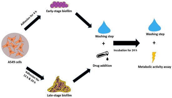 The following assay was used to investigates the effect of the antifungal compounds against immature (4 h), maturing (12 h) and mature (24 h) A. fumigatus biofilm formed on an A549 cell line. Fungal suspensions were prepared as described in Section 2.2 and set to an inoculum of 1 × 105 cells/mL. The cells and the conidial suspensions were incubated together, either in a 96-well flat-bottomed microtiter plate when early-stage 4 h old biofilm was assessed (100 µL cells and 100 µL conidial suspension), or in a 24-well microtiter plate when the 24 h old biofilm was investigated (500 µL cells and 500 µL fungal suspension). An initial incubation of at least 4 h was necessary in order to facilitate the adhesion of the fungal conidia onto the A549 cells, as recommended in previously published studies [20]. The co-cultures were incubated together at 36 °C and 5% CO2. After the specific biofilm incubation time (4 h, 12 h or 24 h) was ended, the medium was discarded, the wells were washed gently (through pipetting) with PBS and the antifungal drugs (see Section 2.3) were added. After incubation for an additional 24 h, the biofilms were washed thrice with PBS to remove any non-adherent conidia. Briefly, 100 µL (4 h and 12 h) or 500 µL (24 h) of an XTT (0.5 mg/mL) (Santa Cruz Biotechnology, Dallas, TX, USA) plus 125 μM menadione (Sigma-Aldrich) solution was added to each well of the plates and incubated for 3 h at 36 °C and 5% CO2. Next, 80 µL of the supernatants were transferred from each well onto a fresh 96-well plate with a U-shaped bottom. The OD492 was measured using a microplate reader (Sunrise Tecan, Hombrechtikon, Switzerland). The workflow of the co-culture assay is summarized in Figure 1.