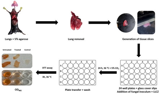Immediately after being placed in the 24-well microplates, the PCLS were infected with a 1 × 105 cells/mL inoculum, which was applied directly on top of the slices. Treatment was either applied together with the inoculum (500 µL fugal suspension and 500 µL antifungal drug), both diluted in DMEM/F-12 medium (Fisher Scientific Waltham, Massachusetts, USA), or later on after an initial 24 h incubation of the biofilm at 36 °C and 5% CO2. At the end of incubation, the glass cover slips were transferred with sterile tweezers onto new 24-well microplates, where they were washed two times with PBS and incubated with 500 μL/well of a XTT solution (0.5 mg/mL) plus 25 μM menadione. The plates were incubated in the dark at 36 °C, the XTT supernatant (100 μL) was transferred from each well into a U-shaped 96-well plate, and the optical density was measured by using a plate reader (Sunrise Tecan, Hombrechtikon, Switzerland) at 492 nm. The effect of the antifungal compounds against biofilm formation on the PCLSs was assessed by comparing the OD492 of treated, untreated and uninfected slices (Figure 2).