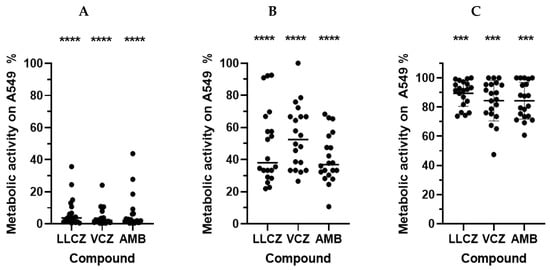 The treatment with all three agents in the co-culture assay showed a significant inhibition of early-stage biofilm metabolic activity, with no obvious cytotoxic effects towards the human epithelial lung cells. AMB showed an overall consistent biofilm inhibition. VCZ and LLCZ, both azoles with a similar mechanism of action [22,23], showed a different metabolic activity inhibition, depending on the growth stage of the biofilm (Figure 3). LLCZ performed better against maturing biofilms (Figure 3B), while VCZ showed a slightly better inhibition of mature biofilms (Figure 3C). The effect of LLCZ showed no difference to the (invertebrate) in vitro anti-biofilm effects studied previously [10], suggesting that the human epithelial cells do not directly influence the LLCZ treatment of A. fumigatus biofilm.