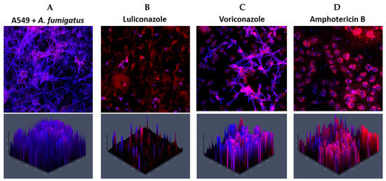 The effect of all three antifungal agents investigated against biofilm in co-culture with the A549 cells was visualized by using CLSM (Figure 4). The fungistatic and fungicidal effects of the three compounds were in line with the ones described in the current literature [10,23,24,25].