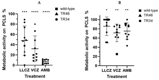 The ex vivo PCLS model showed slightly different results than the co-culture model. When the drug was directly added at incubation start (0 h), the largest decrease in activity was recorded for the infected PCLS treated with AMB (only 7% biofilm metabolic activity). Compared with AMB the effect of LLCZ and VCZ with 48% and 32% biofilm metabolic activity detected was lower (Figure 5A).
