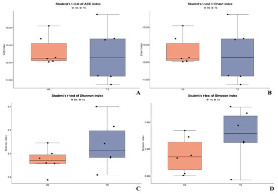 After excluding low-quality reads and those containing N bases, the average number of clean base pairs in the metagenomes of rumen fluid from the TS group and HS group was 10,928,238,869 bp and 11,240,291,310 bp, respectively. The HS group had 312,052,441 more base pairs than the TS group, representing a relative difference of 2.84%. After further removing the host genome sequences, the final number of valid reads in the two groups was 69,797,028.33 and 72,435,689.67, respectively. The HS group had 2,638,661.34 more valid reads than the TS group, with a relative difference of 3.78%. The Q20 and Q30 values were >97% and >95%, respectively (Table S2). These results indicated that the sequencing data were reliable and could be used for subsequent bioinformatics research. The average completeness of rumen microbial genome assembly in the TS group was 75.32%, while that in the HS group was 62.82%. (Table S3), the relative difference in TS compared to HS was 19.90%. Principal Coordinate Analysis (PCoA) revealed that the 6 individuals from populations at the same altitude clearly clustered together. This indicates that despite minor differences among individuals, there were breed-specific differences in the rumen microbial community structure between TS and HS. Furthermore, the HS microbial community showed a higher degree of aggregation, suggesting that its rumen microbial community is more conserved (Figure S1). According to the Venn diagram, there are 829,812 shared non-redundant genes between TS and HS, while TS and HS have 4,931,099 and 4,746,276 unique genes, respectively (Figure S2). Further analysis of the species composition of TS and HS revealed that the Chao1, ACE, Simpson, and Shannon indices (Figure 1A–D) of TS were all higher than those of HS, but the differences were not significant (p > 0.05).