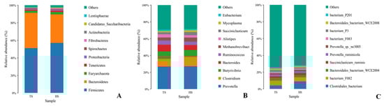 Analysis of microbial community composition revealed that at the phylum level, the core dominant bacterial phyla in both groups were Firmicutes (TS: 37.61%, HS: 41.34%) and Bacteroidota (TS: 29.41%, HS: 23.59%). Notably, Bacteroidota was significantly enriched in TS (p < 0.05) (Figure 2A). while the Firmicutes/Bacteroidetes ratio (F/B ratio) of HS (F/B: 1.75) was higher than that of TS (F/B: 1.28) (Figure S3). At the genus level, the dominant genera were Prevotella (TS: 11.57%, HS: 10.69%) and Clostridium (TS: 3.86%, HS: 4.37%), with no significant difference between the two groups. The next most abundant genera were Bacteroides (TS: 3.39%, HS: 2.29%) and Butyrivibrio (TS: 3.65%, HS: 3.18%). Notably, the relative abundance of Bacteroides in TS was significantly higher than that in HS (p < 0.05) (Figure 2B). The rank sum test showed that Succiniclasticum was extremely significantly enriched in HS (p < 0.001) (Figure S4). At the species level, the proportion of Clostridiales_bacterium was higher in HS, while the contents of bacterium_F082, Prevotella_ruminicola, and Bacteroidales_bacterium_WCE2004 were higher in TS (Figure 2C). LEfSe analysis identified species-level biomarkers, with the characteristic biomarker of TS being Selenomonas ruminantium, and the biomarkers of HS being Mycoplasma sp_CAG_877 and Succiniclasticum ruminis (Figures S5 and S6).