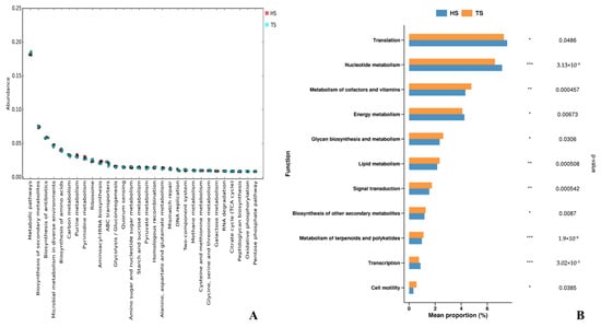 Functional analysis of rumen microorganisms based on KEGG pathways (Figure 3) showed that the KEGG functional genes of TS and HS were mainly enriched in pathways such as Metabolic pathways, Biosynthesis of secondary metabolites, Microbial metabolism in diverse environments, Biosynthesis of amino acids, Carbon metabolism, and Purine metabolism (Figure 3A). Further comparison of functional differences revealed that pathways such as Metabolism of cofactors and vitamins, Glycan biosynthesis and metabolism, and Lipid metabolism were significantly upregulated in TS (p < 0.05). However, the expression levels of the Translation, Nucleotide metabolism, and Energy metabolism pathways in HS were significantly higher than those in TS (p < 0.05) (Figure 3B).
