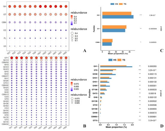 CAZy functional analysis. (A) CAZy content graph at the class level. (B) CAZy content graph at the family level. (C) Bar chart of differential analysis at the category level. (D) Bar chart of differential analysis at the family level. Note: * p < 0.05, ** p < 0.01, *** p < 0.001.