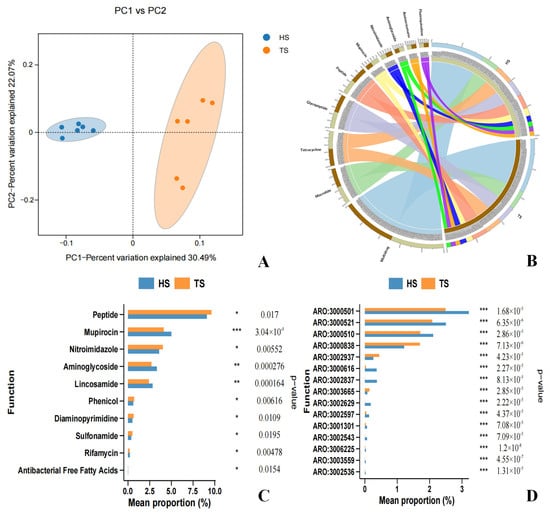 In this study, 486 and 502 types of ARGs with an abundance of ≥10 were detected in the rumen of the TS group and HS group, respectively (Table S4). PCoA revealed that the rumen resistome profiles of the TS group and HS group were clearly separated. Moreover, the sample points of the HS group’s resistome were tightly clustered, showing the characteristic of a highly conserved ARG composition. This suggests that breed difference is a key factor driving the differentiation of rumen resistomes (Figure 5A). Analysis of the composition categories of Comprehensive Antibiotic Resistance Database (CARD) functional genes (Figure 5B) showed that the most abundant category of CARD functional genes in both groups was Multidrug, followed by Macrolide, Tetracycline, Glycopeptide, and Peptide. Further heatmap clustering analysis revealed that the rumen resistomes of the TS group and HS group were clearly divided into two independent clusters, among which the expression levels of more than 60% of the ARGs in the HS group were higher than those in the TS group (Figure S7). Analysis of differences in CARD functional genes (Figure 5C) showed that Peptide had the highest abundance in both groups, with that in TS being significantly higher than in HS (p < 0.05). Similarly, the abundance of Nitroimidazole in TS was significantly higher than that in HS (p < 0.05). In contrast, there was an extremely significant difference in Mupirocin between the two groups (p < 0.001), with the abundance in TS being lower than that in HS. Indicating that there are significant differences in the resistome characteristics of the rumen microbiome between TS and HS. In addition, several linezolid resistance genes (cfrA, cfr (C), cfr (B), etc.) were identified in TS and HS (Table S4), As clinically important resistance genes, the detection of such genes in the rumen of plateau-grazing sheep requires attention to the potential risk of environmental transmission.