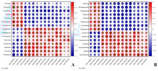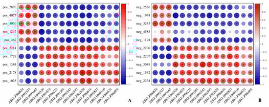 Heatmap of correlation analysis between differential metabolites and ARGs in positive and negative ion modes. (A) Positive ion mode. (B) Negative ion mode. Note: * p < 0.05.