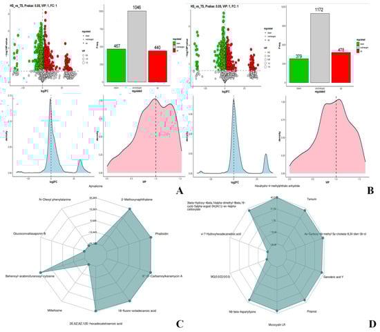Description of rumen metabolome data quality control and differential metabolite analysis charts in TS and HS. (A,B) Statistical charts of differential metabolites. (C,D) Radar charts. ((A,C) are in positive ion mode. (B,D) are in negative ion mode).
