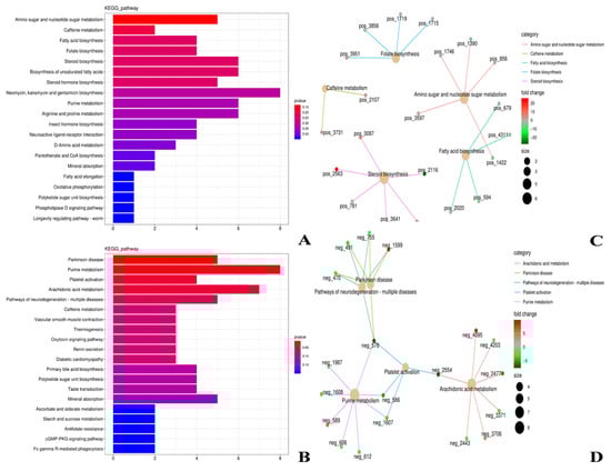 KEGG functional annotation and enrichment analysis of differential metabolites between TS and HS. (A,B) Enrichment bar charts. (C,D) Enrichment network plots. ((A,C): positive ion mode; (B,D): negative ion mode).
