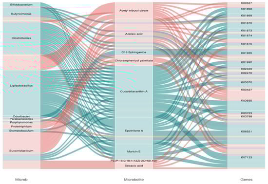 Sankey diagram of microbe-functional gene–metabolite association analysis.
