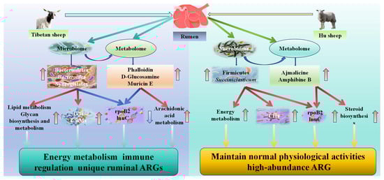 Tibetan sheep are an important livestock breed adapted to the extreme environment of the Qinghai–Tibet Plateau (QTP). Their energy metabolism and environmental adaptability are highly dependent on the rumen microbiome. However, systematic comparisons of the rumen microbiome, its functions, and the resistome between plateau-adapted breeds and lowland breeds remain insufficient. In this study, 6 Tibetan sheep (TS) and 6 Hu sheep (HS) were selected. All the selected sheep had a body weight of 34 kg (±0.5 kg) and an age of 1 year (±1 month) and were all managed under local traditional natural grazing (without supplementary feeding). Using metagenomics and metabolomics techniques, systematic comparative analysis was conducted on the differences in rumen microbial community structure, functions, resistome, and metabolites between the two breeds. Metagenomic analysis showed that at the phylum level, the abundance of Bacteroidetes in the rumen of TS was significantly higher than that in HS (p < 0.05); at the genus level, the abundance of Bacteroides in TS was also significantly higher (p < 0.05). Carbohydrate-active enzymes (CAZy) analysis indicated that the abundance of Glycosyltransferases (GTs) and Carbohydrate-Binding Modules (CBMs) in the rumen of TS were significantly upregulated (p < 0.05), while HS was rich in various Glycoside Hydrolases (GHs). Comprehensive Antibiotic Resistance Database (CARD) analysis revealed that more than 60% of the Antibiotic Resistance Genes (ARGs) in the rumen of HS were present at higher levels than those in TS. Metabolomics identified a large number of differential metabolites, among which metabolites such as 2E,6Z,8Z,12E-hexadecatetraenoic acid, Leukotriene F4, and Tenurin were significantly upregulated in the rumen of TS. Correlation analysis showed that rumen microbial flora and their metabolites jointly act to regulate rumen ARGs. Specifically, microorganisms including Firmicutes and Succiniclasticum had a significantly positive correlation with ARGs such as rpoB2 (p < 0.05), while differential metabolites like endomorphin-1 and Purothionin AII exhibited a significantly negative correlation with ARGs such as rpoB2 (p < 0.05). Therefore, compared with HS, the synergistic effect of the rumen microbial flora, their metabolites, and the resistome in TS is an important characteristic and strategy for their adaptation to the hypoxic environment of the QTP, and also contributes to the formation of their unique rumen resistome. Despite being reared in the same plateau environment, the rumen microbiome of HS still retains low-altitude characteristics, which are manifested as high GHs activity and high ARGs abundance.