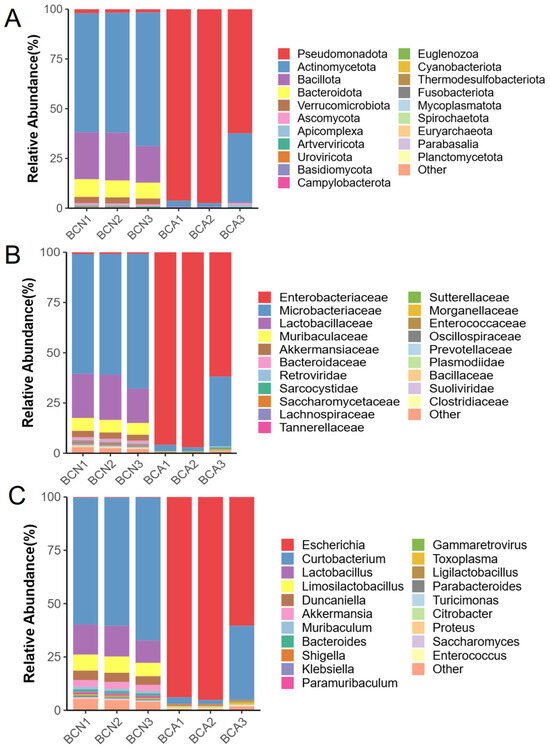 Based on metagenomic data, we systematically compared the composition of gut microbial communities in mice from the BCN and BCA groups at the phylum, family, and genus levels (Figure 2A–C, Table S2). Figure 2A–C show the relative abundance of the phylum, family, and genus levels for each group of overall microbial communities. At the phylum level, the gut microbiota of the control mice (BCN) was dominated by Actinomycetota (62.46%), followed by Bacillota (21.97%) and Bacteroidota (8.43%). The proportions of these phyla decreased significantly in the infected group; in contrast, the Pseudomonadota increased markedly by 83.35% 10 days after infection.