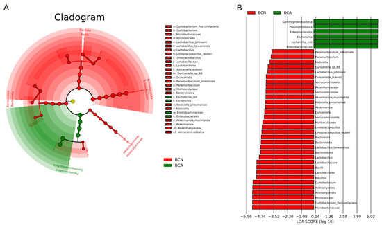 The phylogenetic tree based on LEfSe visualized the significantly enriched taxa in the BCN and BCA groups (Figure 4, Table S3). There was a significant difference in taxonomic composition between the two groups (p < 0.05). The control group (BCN) was predominantly composed of Lactobacillaceae, Muribaculaceae, and Prevotellaceae, as well as several common commensal genera belonging to the phylum Actinobacteria. In contrast, the BCA group exhibited significant enrichment in various Gram-negative opportunistic pathogens, primarily within the family Enterobacteriaceae, including the genera Escherichia and Shigella, as well as other conditionally pathogenic genera classified under the phylum Pseudomonadota.