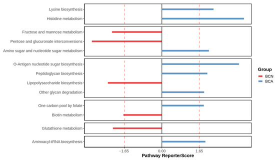 Based on metagenomic sequencing data, reporter score analysis was performed to compare the differences in key functional metabolic pathways between the control group (BCN) and the infected group (BCA; Figure 6). The results showed that the two groups exhibited significantly different functional enrichments in multiple important pathways, suggesting that the infection induced gut microbiota functional profile reconstruction. Significant upregulation of the histidine metabolism and O-Antigen nucleotide sugar biosynthesis pathways was observed in the BCA group. Meanwhile, amino sugar and nucleotide sugar metabolism, as well as phenylalanine, tyrosine, and tryptophan biosynthesis, were also active. In contrast, the BCN group showed significantly suppressed fructose and mannose metabolism, pentose and glucuronate interconversions, lipopolysaccharide (LPS) biosynthesis, bioin metabolism, and glutathione metabolism.