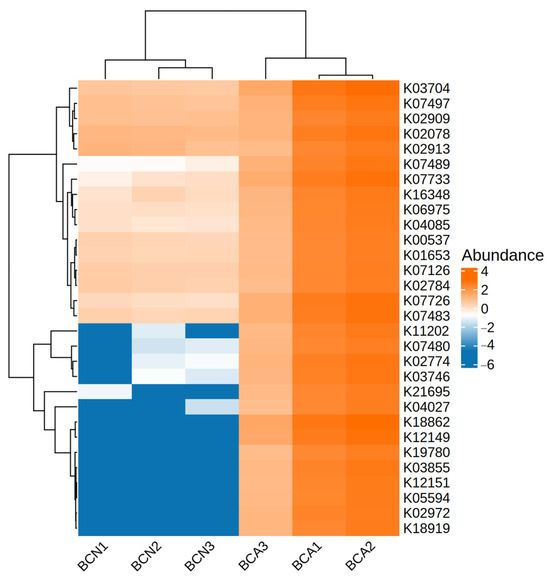 Heatmap of differentially abundant KEGG Orthologs (KOs) in gut microbiota between control (BCN) and acute-infected (BCA) mice. The heatmap shows normalized abundance levels of selected KO functional genes across samples. Orange indicates higher abundance, while blue represents lower expression levels. Multiple KO entries, such as K02784, K02078, and K02774, were significantly enriched in the BCA group.