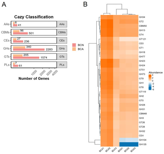 CAZy classification and abundance comparison of gut microbiota carbohydrate-active enzymes between control (BCN) and acute-infected (BCA) mice. (A) Bar graph showing that the number of genes annotated to six CAZy enzyme categories (GHs, GTs, CBMs, CEs, PLs, AAs) is significantly reduced in the BCA group compared to the BCN group, with the most marked decline in glycoside hydrolases (GHs) and glycosyltransferases (GTs). (B) Heatmap showing the abundance distribution of main CAZy families in different samples, with significant upregulations of certain families (e.g., GH23, GH24, GT4, and GT2) in the infected group.