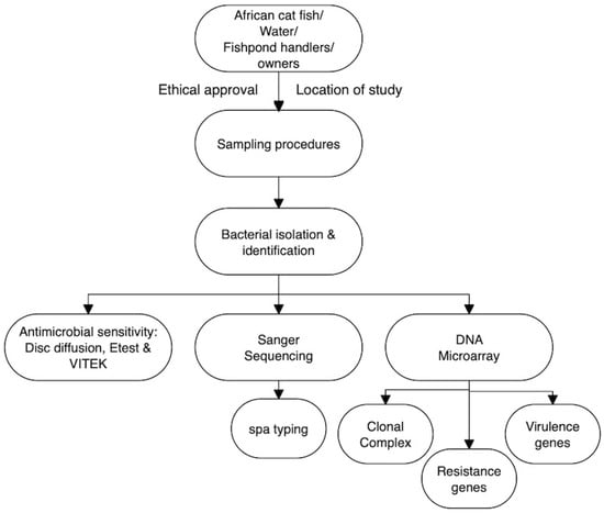 The schematic overview of the experimental program showing the major stages of this current work, from the targeted African catfish, water from the fishponds, and the handlers/owners (of those fishponds), through sampling procedures, to the bacterial isolation, identification, and subsequent analytical/characterization. Etest and VITEK = ETEST® &VITEK brand associated with bioMérieux; spa typing = Staphylococcal Protein A (spa) Typing (Figure drawn using Flowchart Designer 5 Software Version 1.2.25, Apple Inc., California, USA).