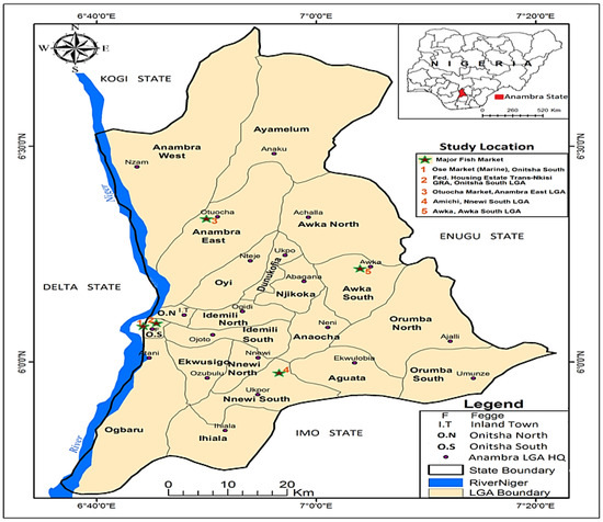 A cross-sectional study was conducted between October 2019 and February 2020 across three Local Government Areas (LGAs), each representing one senatorial zone of Anambra State, Nigeria (Figure 1). The LGAs were selected based on the presence of fish farms, markets, and processing facilities. In each LGA, one major town—Awka, Nnewi, and Onitsha—was selected based on its notable involvement in African catfish (ACF; Clarias spp.) farming and oven-drying, and one fish farm was chosen from each town. Additionally, two fishing communities, Ose and Otuocha, where only smoking is used for fish preservation, were included (Figure 2). Weekly visits were made to these towns, during which a total of 465 ACF were randomly sampled. These included 246 freshly captured fish—64 farmed fish, 138 smoked captured fish, and 17 oven-dried farmed fish. Additionally, 36 water samples were collected, which included 24 from rivers and 12 from fishponds. A total of 106 occupationally exposed individuals involved in fish processing (70 using smoking and 36 using oven-drying were also randomly selected for sampling after obtaining written informed consent. About 5 cm2 area of the skin and freshly cut surfaces in raw fish and processed fish samples were swabbed using sterile swabs. Water samples were aseptically collected by immersing autoclaved 100 mL wide-mouth bottles with screw caps directly into the water (fish-holding [river and fishpond] and fish-processing waters) using gloved hands. Nasal swabs were obtained from each of the 76 fish handlers using sterile swabs. All fish and human samples represented approximately 5% and 50%, respectively, of the total individuals and fish available during the study period. Samples were transported on ice to the Microbiology Laboratory, Department of Veterinary Public Health and Preventive Medicine, University of Nigeria, and processed either immediately or within 24 h of collection for the isolation of Staphylococcus aureus. Importantly, all sampling procedures adhered to good laboratory practices prescribed by the Department of Veterinary Public Health and Preventive Medicine, University of Nigeria, Nsukka, Nigeria.