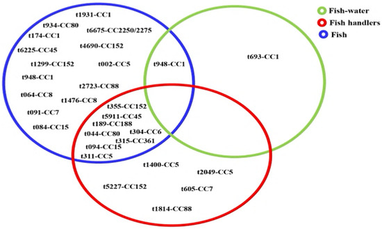 Distribution of 28 spa-clonal complexes of Staphylococcus aureus isolates from fish, fish waters, and fish handlers.