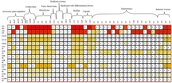 All isolates harbored at least two of the tested virulence-associated genes (Figure 4). The Pantone–Valentine leukocidin gene (lukFS-PV) was detected in 40% of the isolates, with a significantly higher (p = 0.00063) prevalence in MSSA (46.5%) compared to none in MRSA. Other leukocidin genes, lukD/E and lukX/Y, were detected in 84% and 88% of isolates, respectively (Table 6). The lukFS-PV gene was most common in CC152 (100%), CC1 (85.7%), CC15 (85.7%), and CC80 (75%), but was rare in CC5 (10.5%). All isolates carried lukD/E (except those of CC45 and CC152) and lukXY (absent in CC152) (Figure 4).