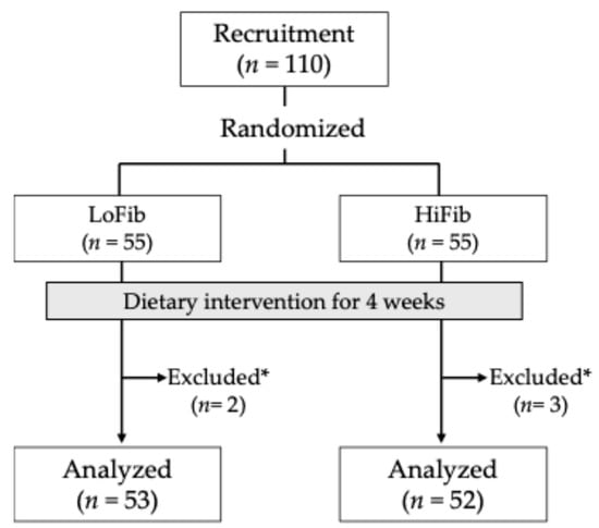 The initial participants were randomly assigned into two groups: low-fiber group (LoFib, n = 55) and high-fiber group (HiFib, n = 55) (Figure 1) according to a randomization table generated by a computer. The randomization table was created using the R programming originally developed by a contract research organization (Ortho Medico Co., Ltd., Tokyo, Japan) based on a general block randomization method with variable block sizes. The allocation ratio between the two groups was 1:1. The correspondence between groups and blocks was securely retained by Ortho Medico and remained concealed from both participants and researchers until the completion of all analyses. The height and body weight of the participants were measured from 14 July to 3 August 2024 at Takara Clinic.