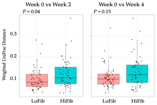 Regarding beta-diversity, the distance based on weighted UniFrac metrics between weeks 0 and 2 in paired samples was significantly higher in the HiFib group than in the LoFib group, meaning the changes in the bacterial composition were greater in the HiFib group than in the LoFib group (Figure 2). In both groups, distances based on unweighted UniFrac did not differ between weeks 0 and 2 and between weeks 0 vs. 4.